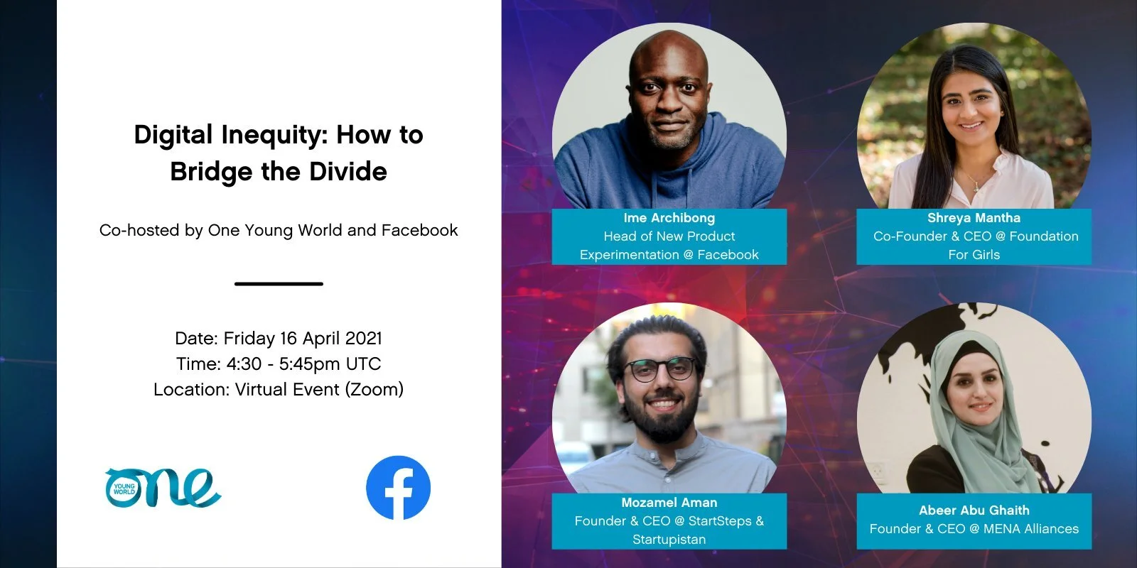 Digital Inequality: How to Bridge the Divide Friday, April 16, 2021 12:30 PM 1:45 PM Google Calendar ICS Join One Young World’s digital event with Facebook to address the greater inequalities imposed by labour market changes, gaps in education and the gender divide. Identify how to harness social media to bridge societal divides. Register here.