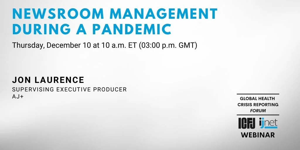 Newsroom Management During A Pandemic Thursday, December 10, 2020 10:00 AM 11:00 AM Google Calendar ICS How has newsroom management changed as a result of #COVID19? In this webinar, AJ+’s Jon Laurence will share how his newsroom adapted, including what training and development the organization put in place for management & staff. Register.