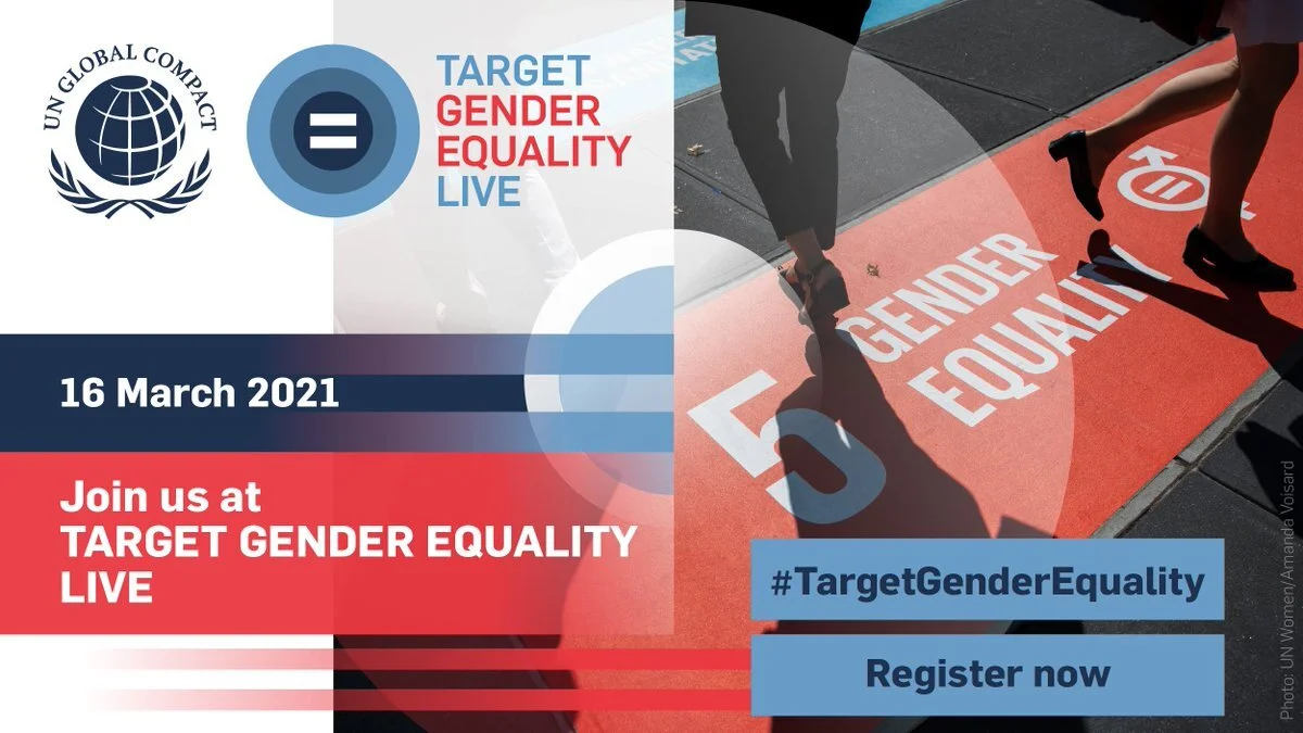 Target Gender Equality Live Tuesday, March 16, 2021 9:00 AM 9:00 PM Google Calendar ICS Registration is now open for #TargetGenderEquality LIVE! Join the UN Global Compact on 16 March for a virtual event showcasing how the private sector can drive progress on Gender Equality.Register.