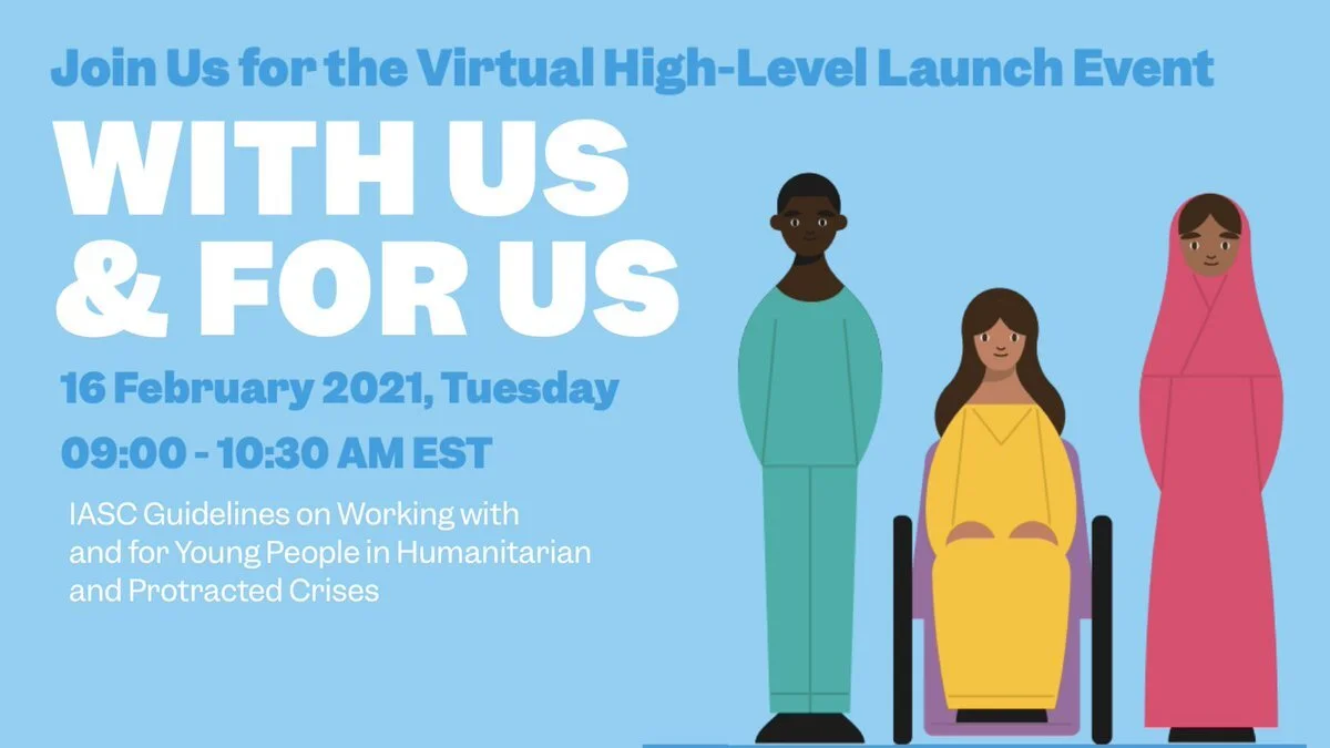 With Us and For Us Tuesday, February 16, 2021 9:00 AM 10:05 AM Google Calendar ICS Unsure of how to partner with young people when a crisis hits? Learn more & join the virtual high-level launch of the Inter-Agency Standing Committee’s Youth Guidelines "With Us and For Us" Register here.