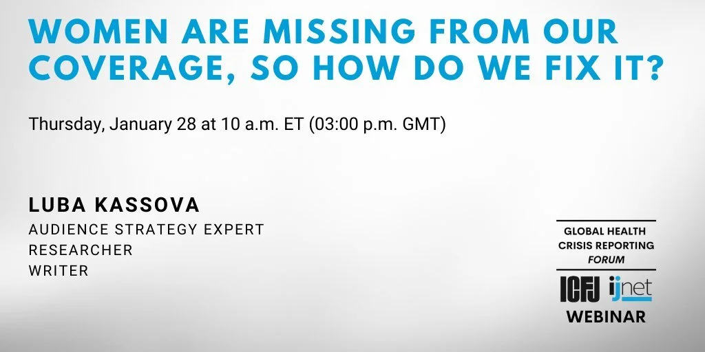 Women are missing from our coverage, so how do we fix it? Thursday, January 28, 2021 10:00 AM 11:15 AM Google Calendar ICS A discussion with Luba Kassova, an audience strategy expert and researcher, and author of “The Missing Perspectives of Women in News.” Moderated by IJNet Managing Editor Taylor Mulcahey.RSVP.